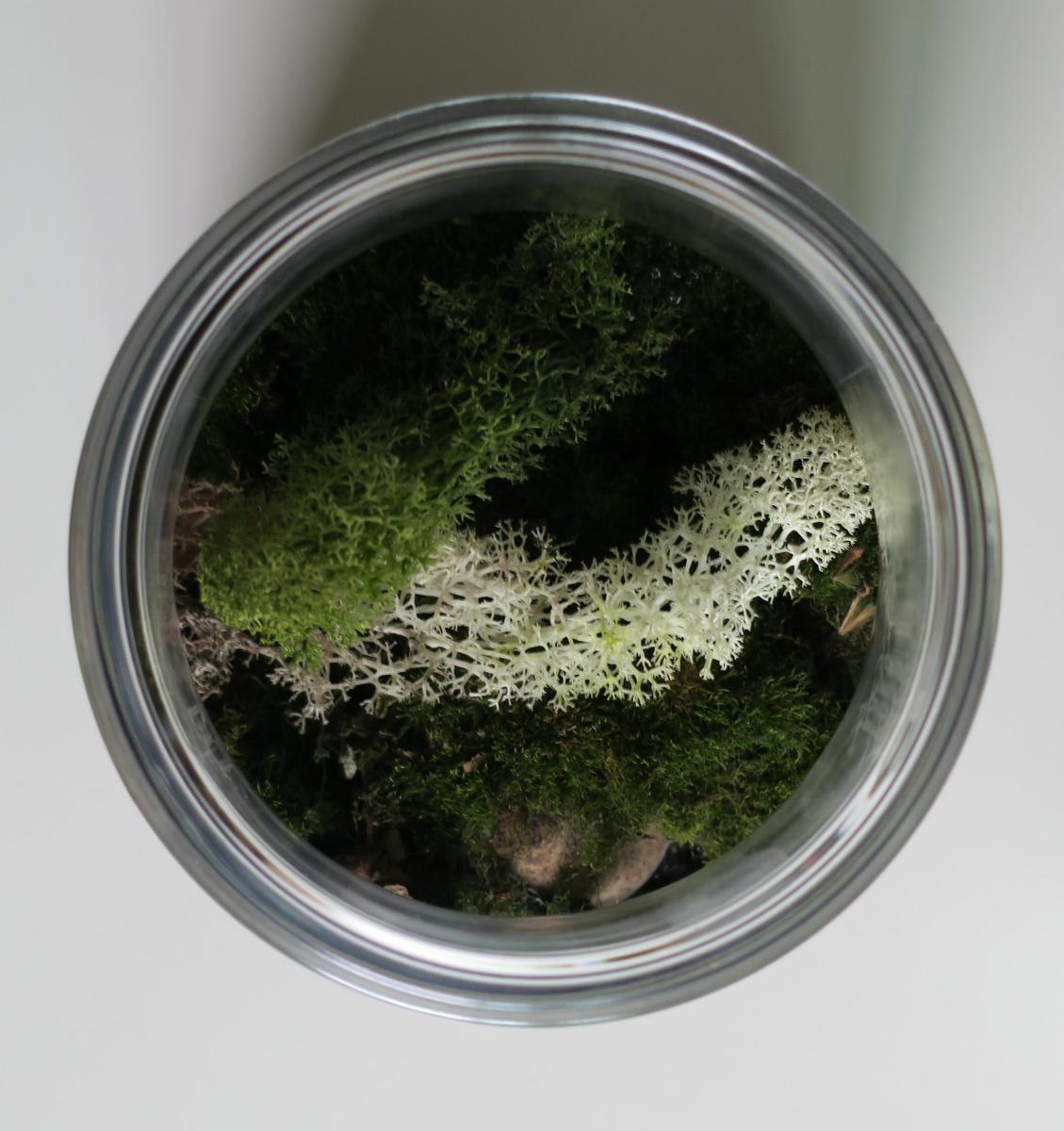 Coloca el musgo encima de las piedras hasta cubrir toda la superficie. Después vamos a rellenar el frasco con agua, y el musgo ayudará a que la planta aérea no esté en contacto con el agua.