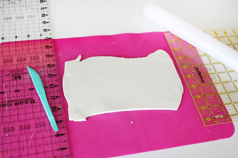 Con el rodillo (y sobre la superficie de corte) estiramos la arcilla hasta para hacer la figura rectangular. Es importante que el grosor de toda la pieza sea homogéneo para que quede bien.