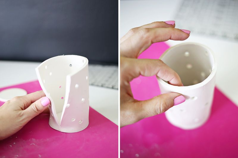 Ahora, poco a poco, vamos haciendo agujeros con la pajita. Podemos hacer tantos como queramos (siguiendo un patrón, a lo loco....) pero es importante no hacer demasiados para que la pieza no rompa.
