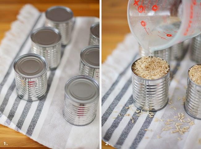 Después solo tenéis que llenar las latas de agua y arroz y al congelador, eso ayudará a la hora de hacer los agujeros para que la lata no pierda su forma habitual con los martillazos.