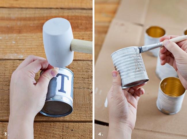Lo primero es retirar todas las etiquetas de las latas, la peor parte son los restos de pegamento así que nada mejor que darles con alcohol o quita esmaltes que es mano de santo. Una vez las tenéis limpias pintar las latas, podéis hacerlo con pintura en spray que además hay muchísimos colores y acabados.
