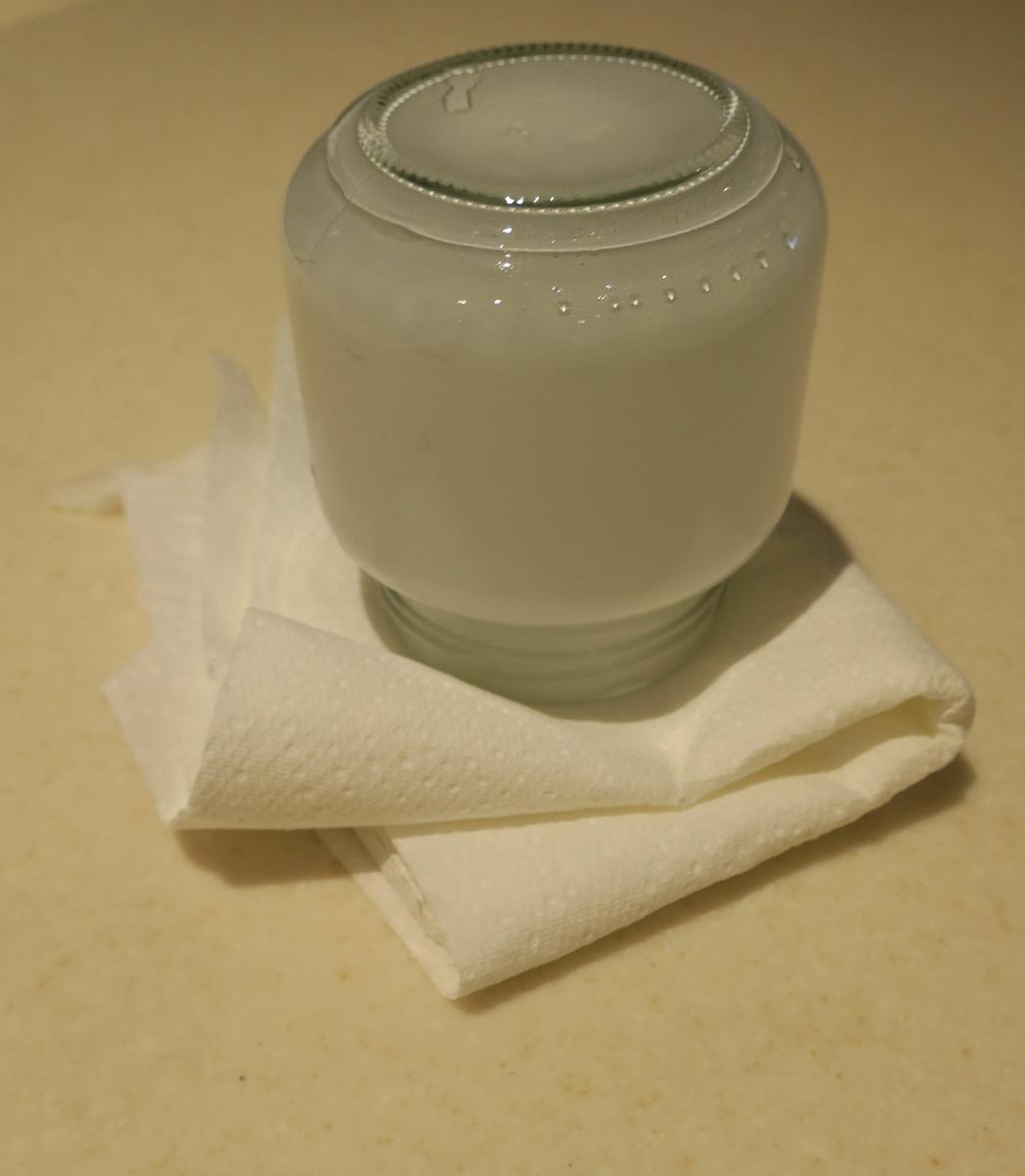 Después, mezcla un poco de pintura blanca con agua (o de cualquier otro color, a mí me gusta el efecto que queda con blanco) y mételo en el tarro. La mezcla tiene que ser bastante líquida, porque si no dejará marcas cuando lo vacíes . Cierra la tapa y agita bien. Cuando esté todo cubierto, vacía el tarro con cuidado de no poner todo perdido y deja secar boca abajo para que caiga toda la pintura sobrante.