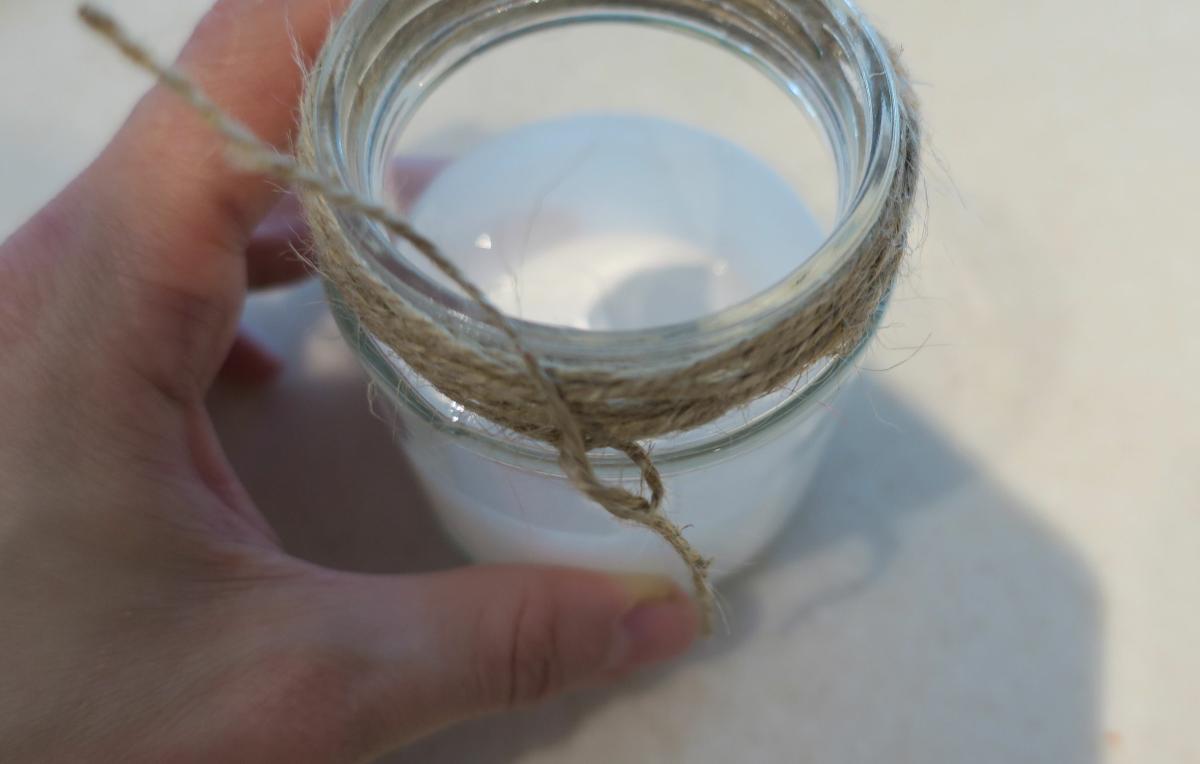 Por último, enrolla la cuerda alrededor del cuello del tarro tapando las guías que tiene el cristal para la tapa y ata un nudo.