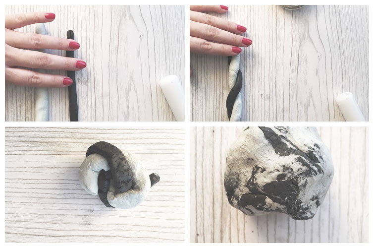 Hacemos dos tiras largas. Una con la arcilla blanca y otra con la negra. Mejor poner menos cantidad negra (o nos quedará un "mármol" muy oscuro), pero eso va al gusto.