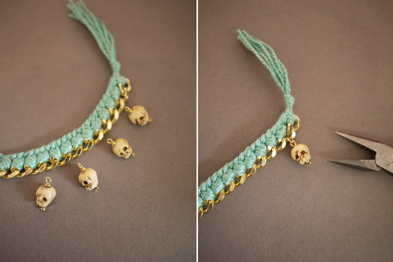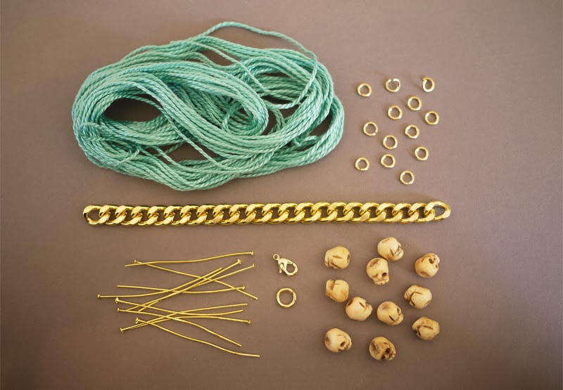 La pulsera de hoy tiene unos pequeños motivos de calaveras, tan de moda este último año. Espero que te gusten. Una vez mas te dejo la lista de materiales y unas imágenes explicativas para la realización.
