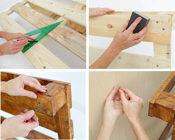Con la ayuda del berbiquí, haz unos pequeños agujeros en los extremos superiores del palé; así evitarás que la madera se raje. En ellos irán metidas las hembrillas. Asegúrate que estén a la misma altura antes de fijarlas con el atornillador.