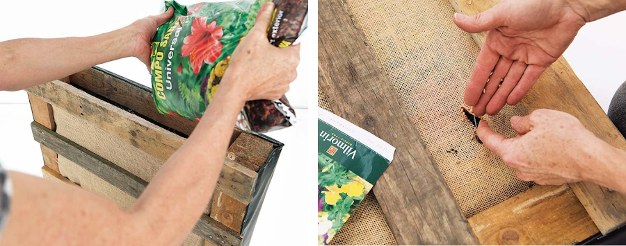 Con las tijeras, realiza pequeños cortes en la arpillera a unos 15 cm de distancia del palé. Introduce a través de estas hendiduras semillas y riégalas. Repite la operación en todos los huecos que quedan. Al finalizar, ya puedes poner el palé vertical.