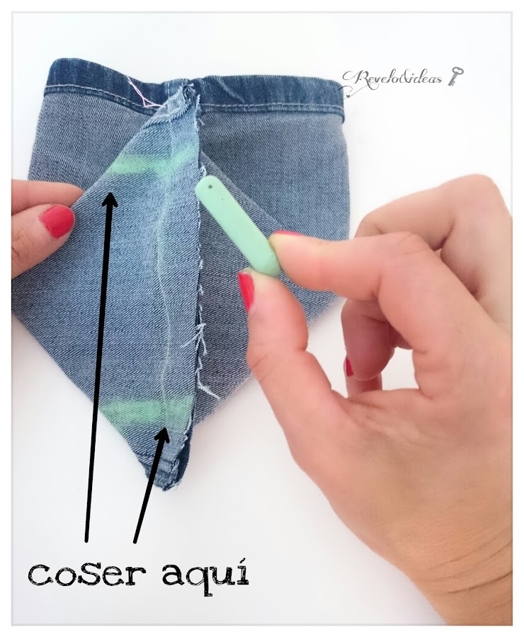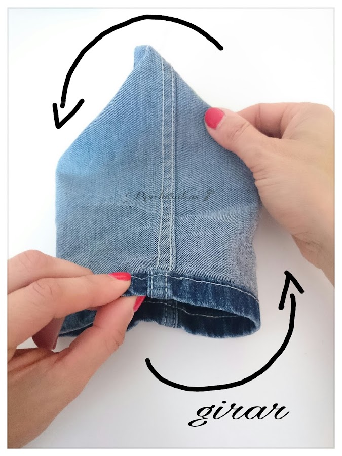 Una vez cosido, giraremos el vaquero, como se ve en la imagen, la cual nos tendrá que quedar, con las costuras laterales en el centro de la pieza, con una forma de triángulo en la parte superior.