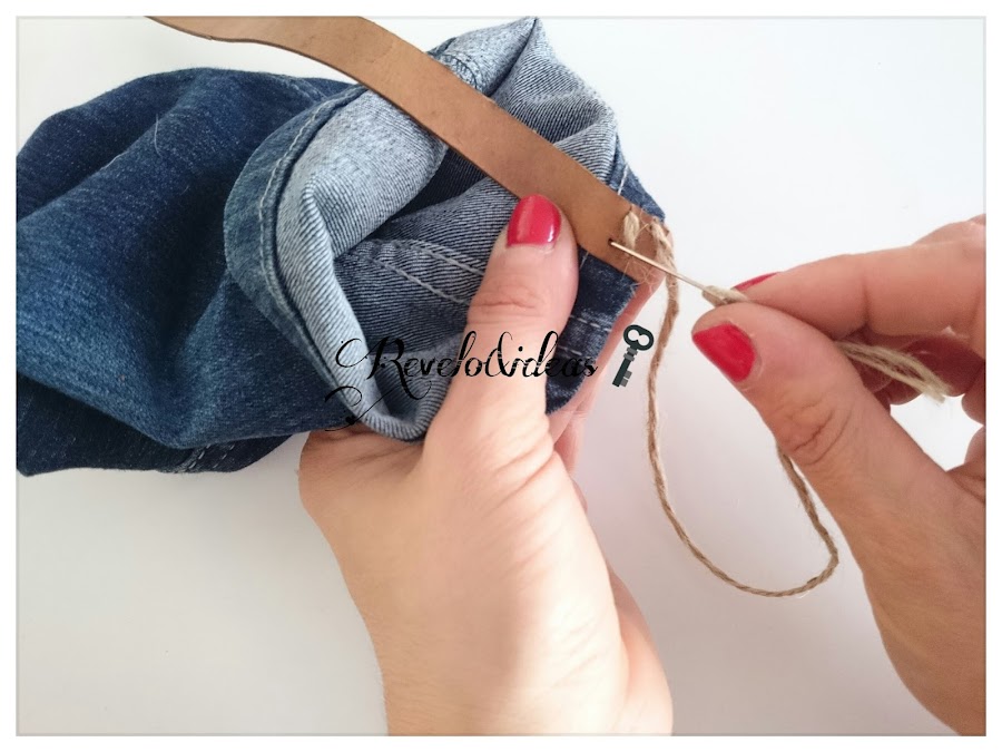 Con una cuerda de esparto fina, coseremos las tiras de cuero, en los cuatro orificios que hicimos en el extremo, en forma de cruz.