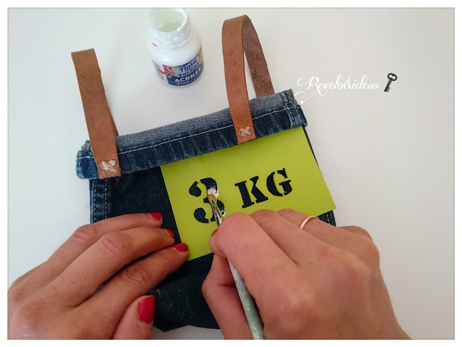 Con una plantilla de letras y números hacemos el estarcido de las letras, esta plantilla la hice yo misma, pero en el mercado encontrarás muchas ya elaboradas que podrás comprar, si quieres saber como se hacen puedes verlo aquí.