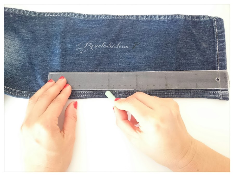 El primer paso será seleccionar la parte del vaquero que vamos a utilizar que será la patera, marcaremos con la regla y una tiza una medida de 20 centímetros, en ambos lados de la patera.