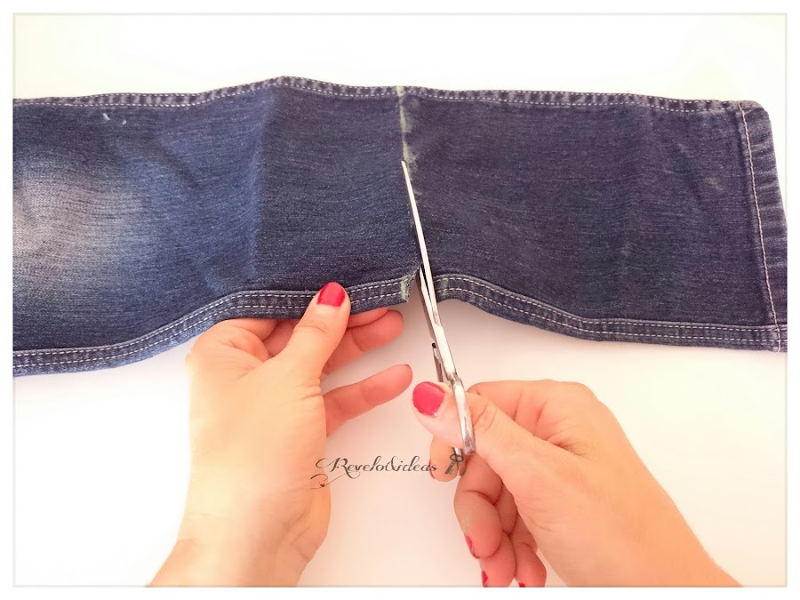 Cortaremos la tela vaquera, por la linea que hemos marcado.