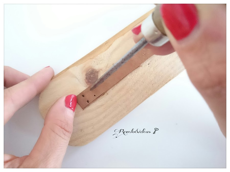 Lo siguiente será hacer cuatro orificios, en cada esquina de las dos tiras cortadas en el paso anterior, con ayuda de punzón utilizando un taco de madera debajo.
