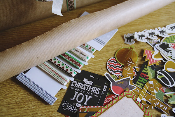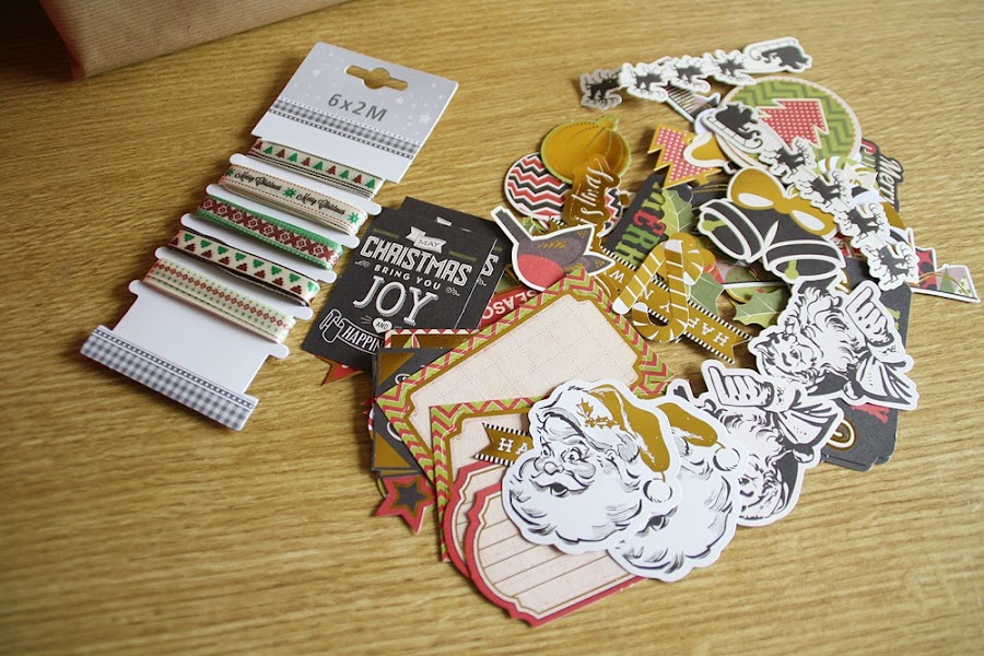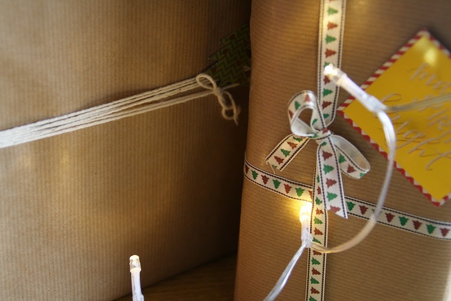 Lo que he empleado para hacerlo han sido varias cintas con motivos navideños de la tienda Casa, etiquetas para tarjetas y regalos de la tienda Casa, cordel blanco y papel kraft normal y rojo.
