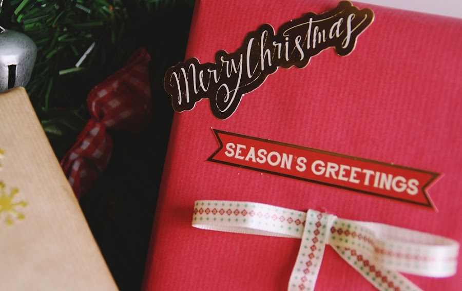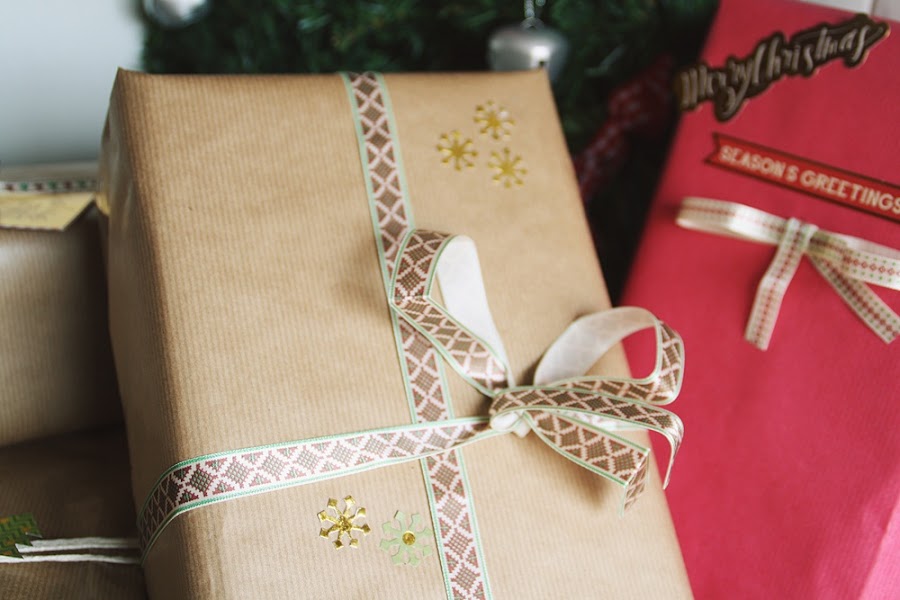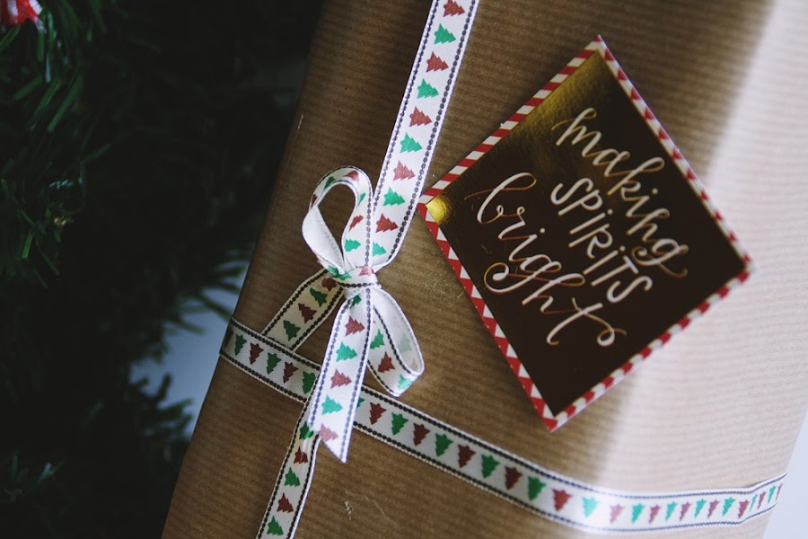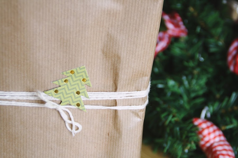 Con estos materiales creé cuatro modelos de paquete de diferentes estilos. El primero de ellos con la cinta más gruesa y etiquetas de copos de nieve. El segundo con una etiqueta dorada con una frase de un villancico típico. Making spirits bright... El tercero quise hacerlo más minimalista y super simple, con un cordel blanco y una etiqueta de árbol de Navidad. Y el último, para darle algo de color al conjunto, lo hice con papel rojo, un lazo de cinta, una etiqueta de merry chistmas y otra etiqueta con una frase típica navideña.