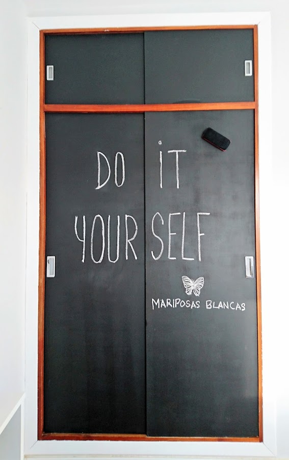 Nos decidimos por pintura pizarra de color negro, porque buscábamos darle un aspecto de pizarra clásica, pero la tenéis en muchos otros colores.