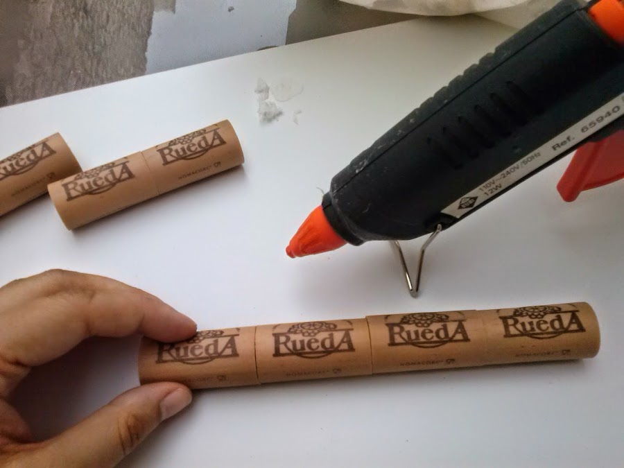 - 8 corchos de vino: Es más cómodo elegir todos los corchos del mismo vino porque son iguales de tamaño, pero se pueden poner diferentes y el efecto visual es más bonito.