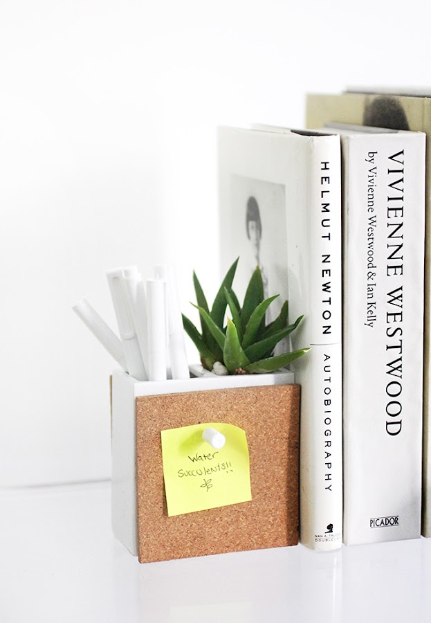 Un espacio handmade para decorar con una planta que sobrevive ¡Y damos fé de ello! jajaja! y espacio para organizar los libros y los bolígrafos con mucho estilo.