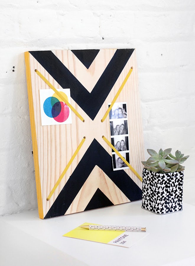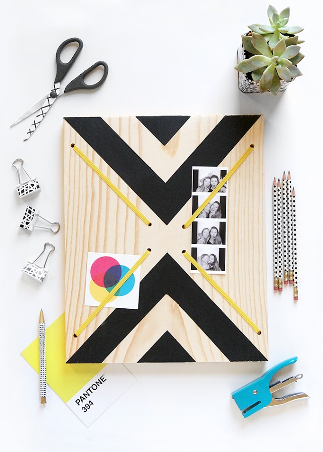 Con la cinta hacer las marcas que nos guiarán para pintar sin cometer errores. Una vez que lo hayamos pintado con cuidado y la pintura se haya secado retirar las cintas y ya tendremos el tablero con las figuras diseñadas. Nos quedará simplemente hacer unos agujeros por dónde pasaremos las gomas que ataremos en la parte posterior. ¡En estas gomas es dónde pondremos todo lo que no queramos perder nunca de vista! ;)