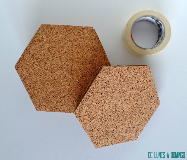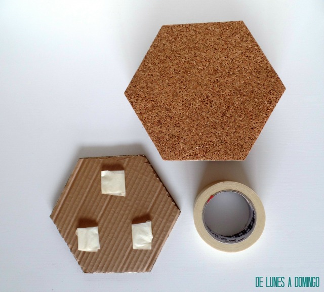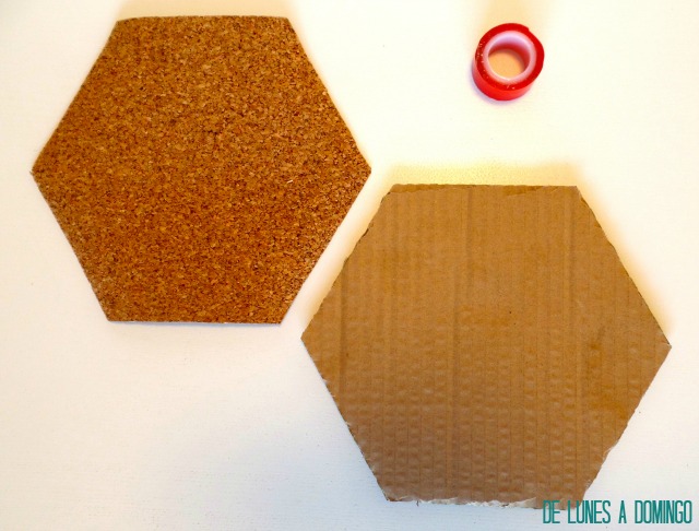 Pues lo tenemos listo. Ya sólo falta darte nuestro toque personal. En mi caso, empleé los dos hexágonos centrales para darle un toquecito de color. Rodeé el contorno de uno de ellos con whasi tape, y como sobre el corcho tiende a despegarse, fijé los extremos con el modelo de chincheta de toda la vida ;) En el otro, una imagen recortada en forma del hexágono pero de menor tamaño, para que el propio corcho actuase como su marco.