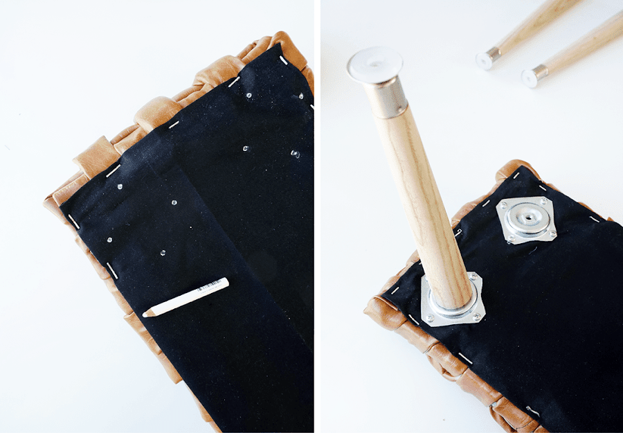 4) Tomamos varias tiras de cuero que tenemos preparadas con su relleno dentro, y grapamos los extremos en la parte de la madera donde tenemos los orificios para las patas.
