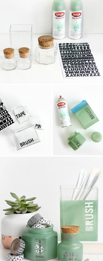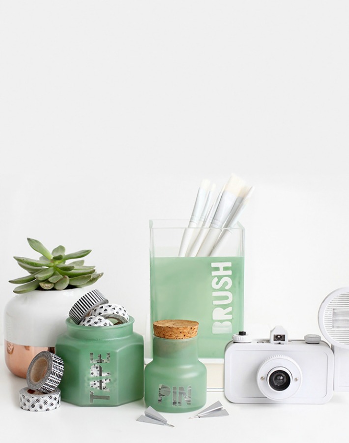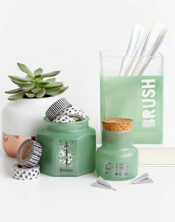 Empezamos colocando las letras de vinilo en los tarros y jarrón rotulando el nombre de los materiales de oficina o manualidades que pondremos en su interior una vez finalizado el proceso.
