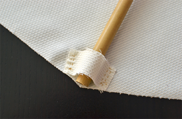 Cortamos la tela, con el siguiente patrón, y en cada esquina donde irán puestos los palos, cosemos un pequeño retal para sujetar la tela y tensarla.