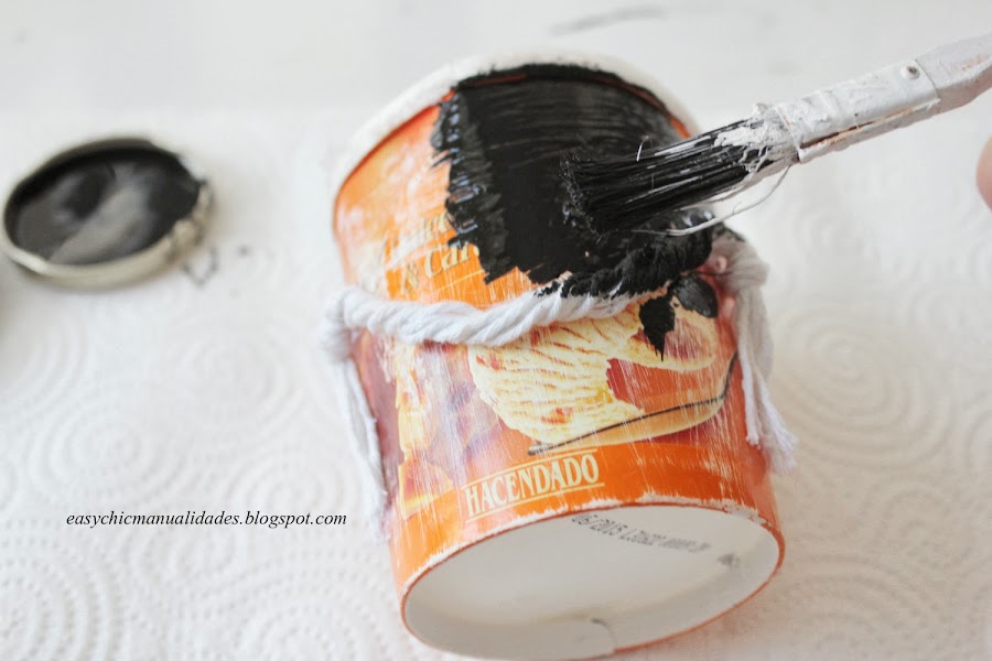 Con un cordón de algodón o varios hilos de algodón anudados a cada extremo, realizamos una forma de arco o cuerda colgante y lo pegamos al bote de helado con silicona caliente.