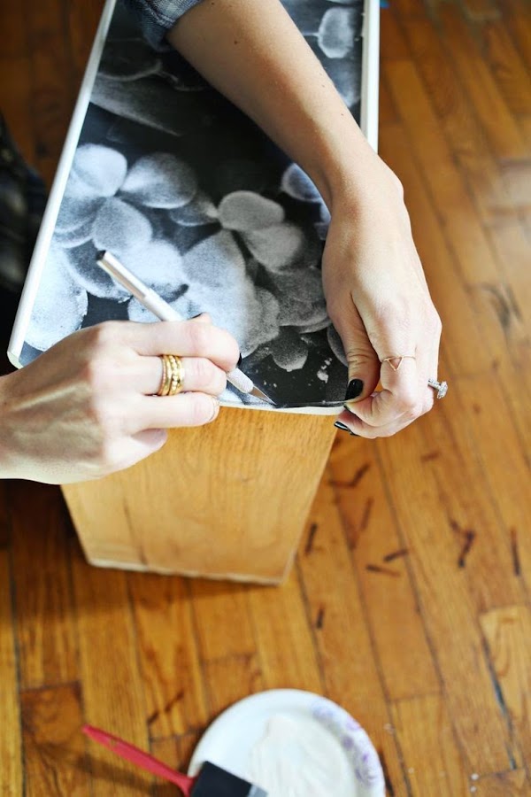 Puedes usar cinta de pintor para asegurarte que la fotografía queda bien colocada en una mitad, mientras puedes pegar la otra mitad aplicando una fina capa de la cola para decoupage.