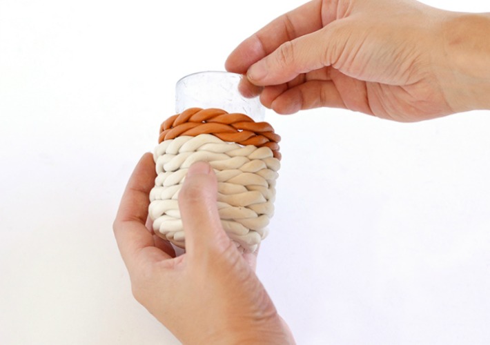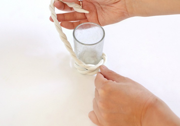 5.-Creamos un circulo con la arcilla blanca del diámetro de la base del vaso de cristal. Posteriormente vamos subiendo hasta cubrir una superficie a media altura del vaso.