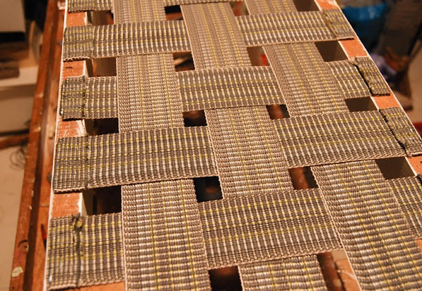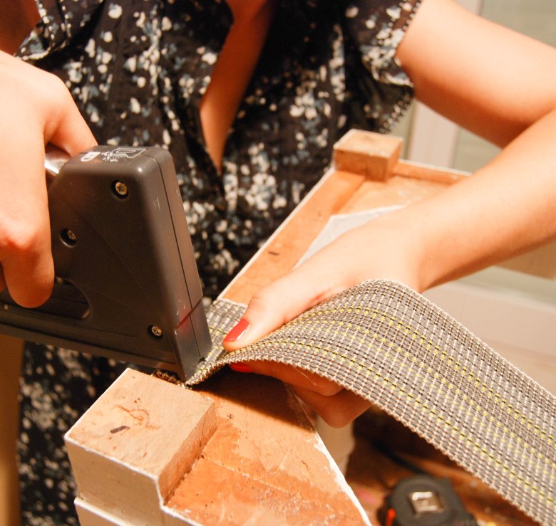 El siguiente paso es colocar las cinchas nuevas (ya que las de esparto estaban deshechas). Gracias a las fotografías, sabíamos cuántas colocar y por dónde empezar. Hay que distribuirlas homogéneamente y conseguir que queden bien sujetas con un dobladillo y doble sujeción con grapas. La segunda cosa más importante es que queden bien tirantes, por eso es importante hacerlo entre dos o con ayuda de una herramienta: