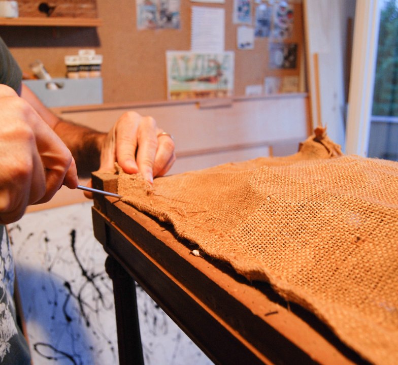 Cubrimos los muelles con tela fina para poder hacer el siguiente paso: colocar el crin. En nuestro caso, conservamos el antiguo, lo humedecimos con una solución de agua y jabón para limpiarlo de polvo y que fuera más manejable. El margen lo hicimos con ayuda de una cuerda sobre la que fuimos enrollando el crin, de manera que quedaba más duro que en el centro. Aunque al principio da un poco de miedo, vas colocando el crin ordenadamente y peinando con los dedos. El efecto final parece despeinado y muy inflado, pero en el siguiente paso todo parece tener sentido: