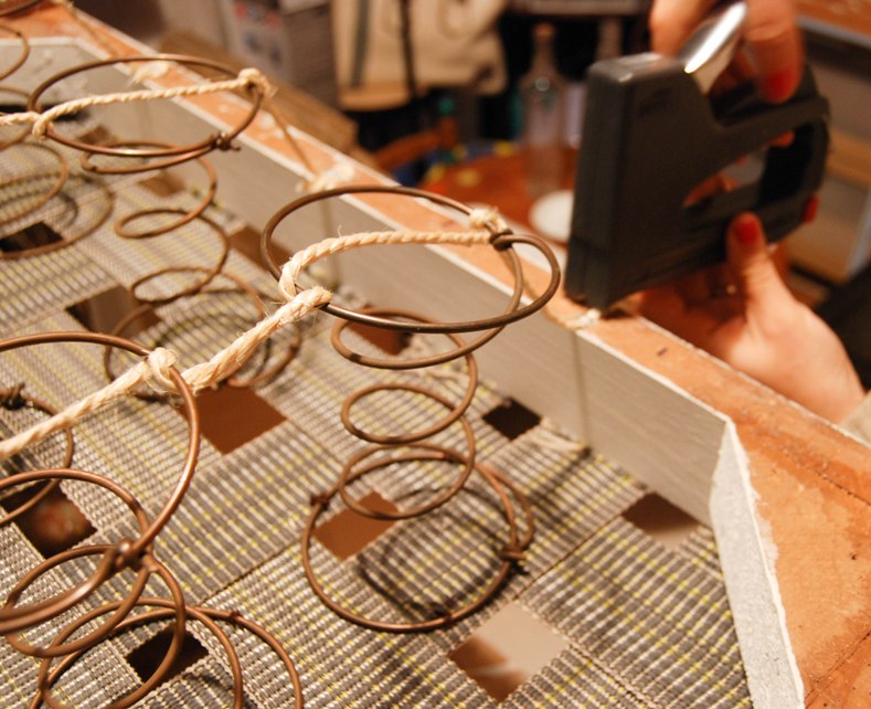 El siguiente paso es colocar los muelles. En nuestro caso estaban en perfecto estado y, como siempre recomendamos, si el original está bien, reutilízalo mejor que comprar uno nuevo, ya que las calidades son muy diferentes. Primero los distribuimos homogéneamente, después los cosemos para fijarlos sobre las cinchas y por último, los fijamos con cuerda para que se mantengan rectos al sentarnos sobre ellos:
