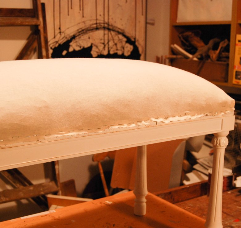 Como ves, a pesar de ser una pieza muy antigua, su estado era bueno: no tenía carcoma, la madera presentaba el barniz en mal estado y algunos arañazos, el relleno del tapizado se había hundido con los años y no era cómoda para sentarse. Y lo peor de todo, es que no encajaba con la decoración actual. Lo que hicimos fue escoger la tela, que fue un flechazo de su propietaria, y decidir los acabados en base a ella y a la decoración de la habitación. Uno de los mayores trabajos, e imprescindible por otro lado, fue documentar detalle a detalle cómo había sido tapizada, para poder repetirlo después, por eso fotografiamos cada paso que hacíamos a medida que desmontábamos el tapizado y preparábamos la pieza para repararla y pintarla: