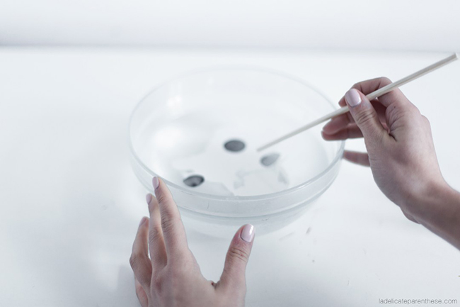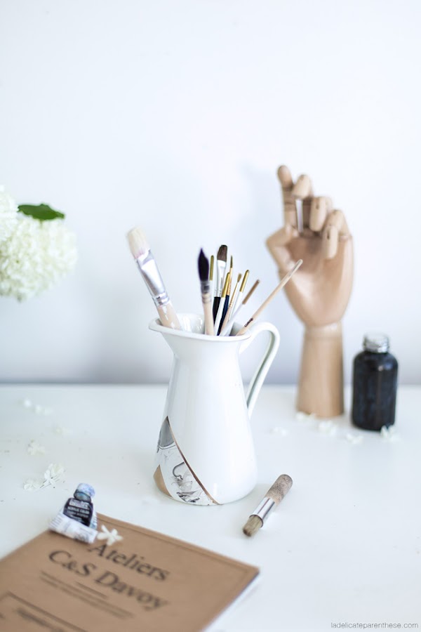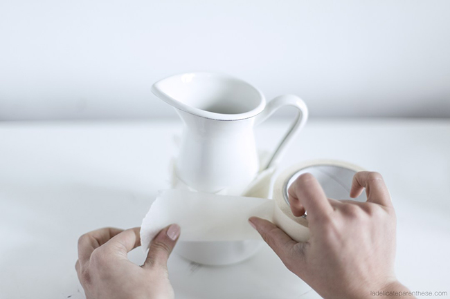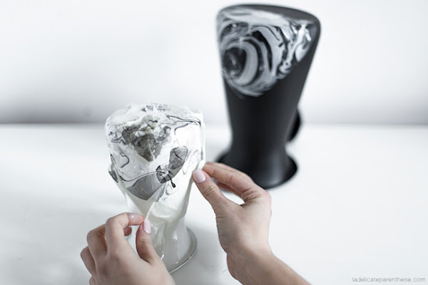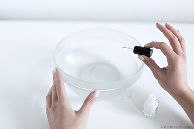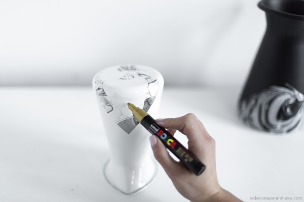 Un bol con agua, varios pintauñas de diferentes colores, romover y cinta de pintor para marcar los límites de la base que quieres pintar. Sumergir la jarra, dejar secar y terminar pintando con permanente en un color metalizado. Pero lo mejor es sin duda que lo veas en las fotos seguro que no te queda la menor duda.