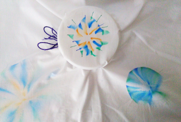 Dibujas unas lineas con rotuladores de diversos colores de manera concéntrica y viertes un chorrito de alcohol sobre el dibujo.