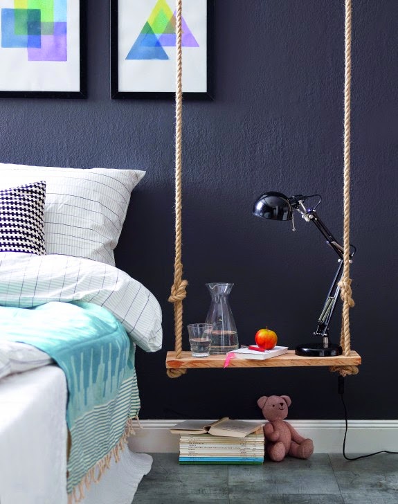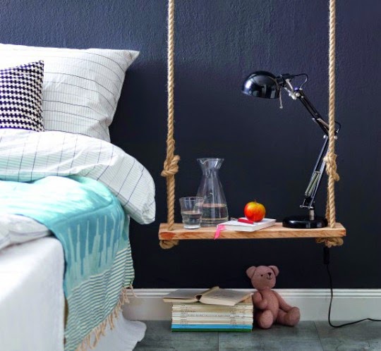 Hace más de una año que vi este columpio que hace las veces de mesita de noche, pero hoy he encontrado el tutorial para realizarla. Una mesita original y creativa que te podrás realizar su solo con un poco de esfuerzo y las herramientas necesarias. En cuanto a los materiales son sencillos de conseguir; madera de unos 3 cms de grosor, maroma o cuerda gruesa y dos hembrillas fuertes para sujetar el columpio desde el techo. Cuando tengas reunidos todos los materiales tan solo tienes que seguir las instrucciones que vienen reflejadas en las imágenes.