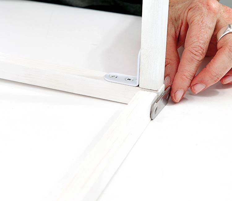 Corta 4 listones de 1,70 cm para los postes verticales, 2 listones de 66 cm para los laterales horizontales y otros 2 listones de 1,23 cm para los lados más largos. Lija y pinta. Une los listones con escuadras y placas.