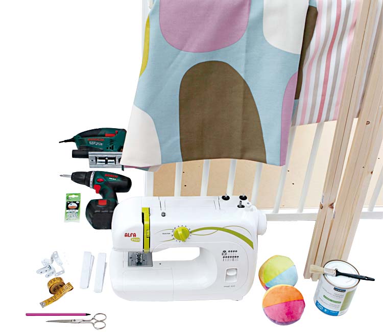 Atornilla la estructura armada al cabecero y al piecero de la cuna. Para hacer el dosel, corta dos piezas de tela de 300 x 70 cm de ancho cada una, de distinto modelo. Enfréntalas derecho contra derecho y cose los laterales dejando 2 cm de margen.