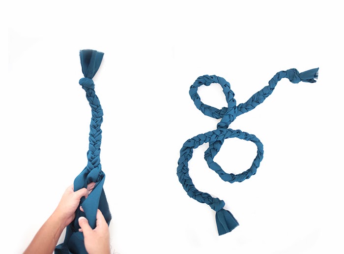 Uniremos los tres trozos con un nudo y los trenzaremos, finalmente pondremos otro nudo.