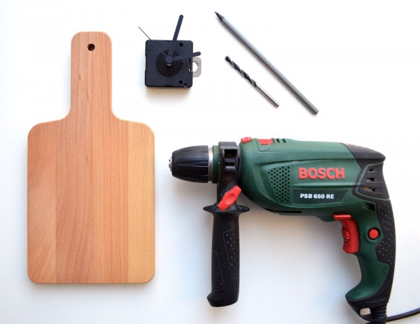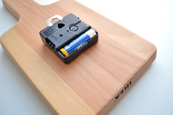 Está hecho con una tabla de cortar de esas que utilizamos en la cocina. Lo bueno es que ahora puedes encontrar estas tablas de todas las formas y tamaños posibles. Así que te puedes hacer el reloj con la forma que más te guste. Después sólo tendrás que colocar la maquinaria del reloj, y ya lo tendrás listo.