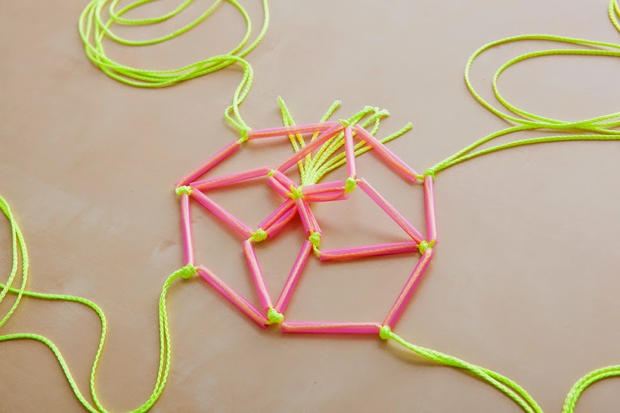 7. Añade el segundo juego de la paja para la cuerda y ata los cordones adyacentes - comenzarás a ver una forma de estrella .