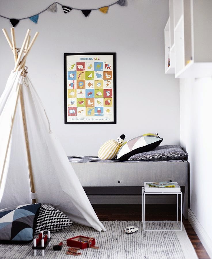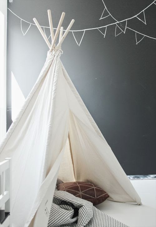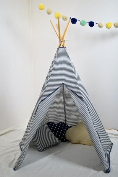 Se trata de los típicos tipis de los indios trasladados a nuestra casa. Son muy sencillos de hacer, hemos encontrado este tutorial. Solo hacen falta palos de madera circulares, que los tenéis en Leroy muy baratitos, cuerda y tela. Con todo esto e imaginación las opciones son infinitas, podéis usar telas lisas, estampadas o con rallas, añadir decoración en la punta..