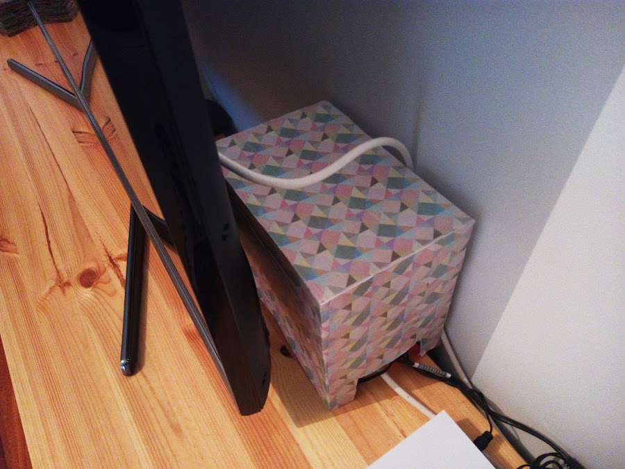 En un principio, iba a comprar una caja organizadora de cables que tienen en Ikea. Es blanca con una tapa de corcho, así que me iba genial con la decoración, pero entre que Ikea me queda a una hora de camino y que la caja cuesta sobre 12 €, pues esa idea no llegó a cuajar.