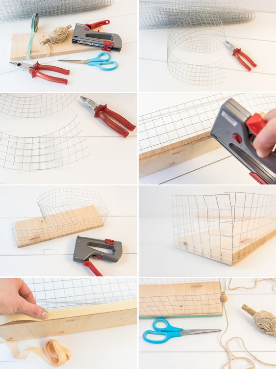 En primer lugar y el trabajo un poco más largo, es el de cortar con ayuda de los alicates la malla metálica para dejarla a la altura que deseamos. Una vez que ya tenemos preparada la rejilla sólo tenemos que ir grapando alrededor de la tabla.