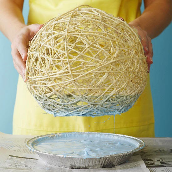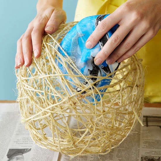 8. Una vez secos los cordeles y endurecidos pincharemos la pelota y la extraeremos. Con cuidado y paciencia para no deshacer el trabajo realizado. Más vale esperar un poco a que salga todo el aire de la pelota o el globo que desmontar lo que hemos creado con los cordeles encolados.
