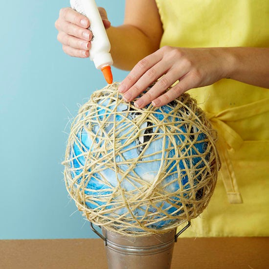 6. Enrollamos el cordel impregnado en cola sobre la pelota de playa o globo. Deja la zona marcada previamente libre de cordel. Con un poco de cinta adhesiva pega el cordel a la pelota hasta que se seque la cola.