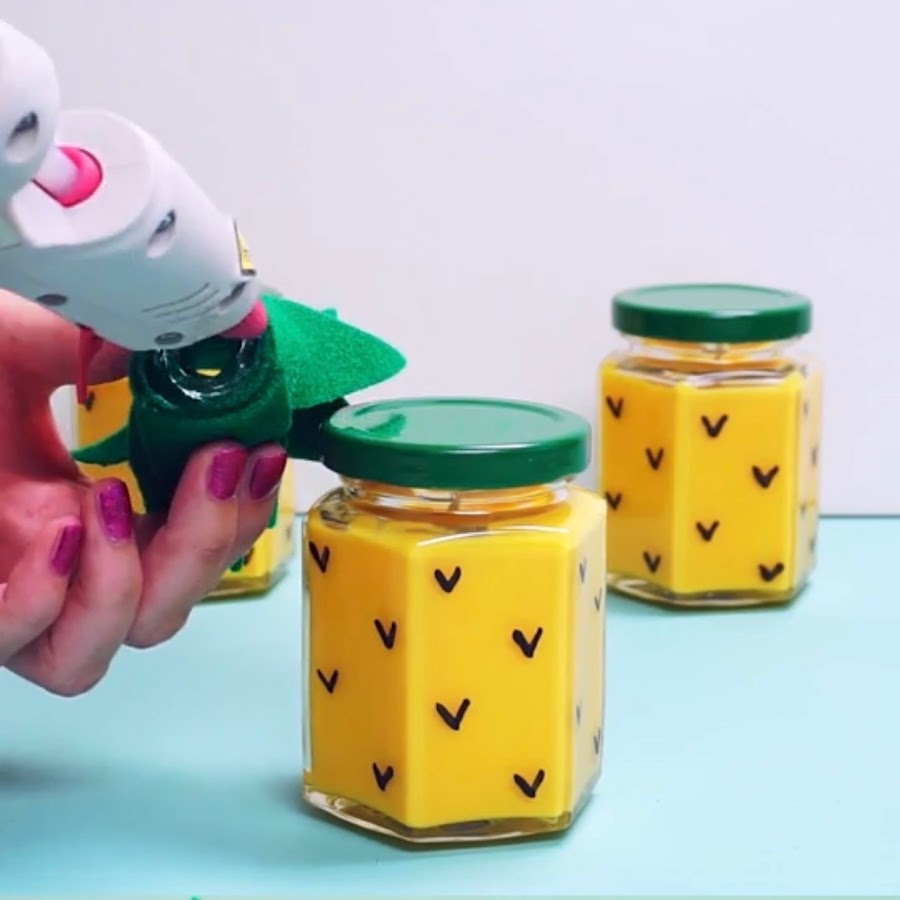 Usa la pistola de silicona caliente para unir las cubiertas de fieltro a las tapas de los frascos.