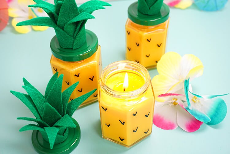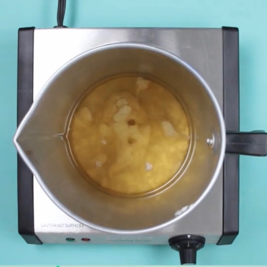 Agrega 3 bloques de colorante de cera amarillo junto con 20-30 gotas de aceite de fragancia de piña. Mezclar bien.