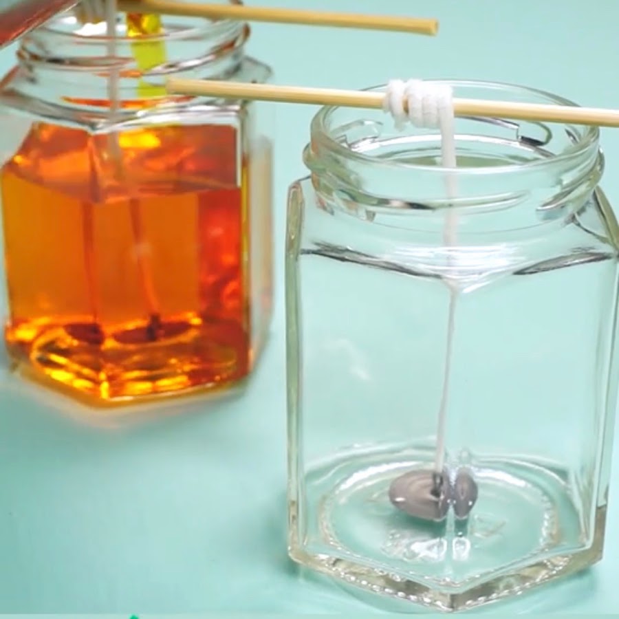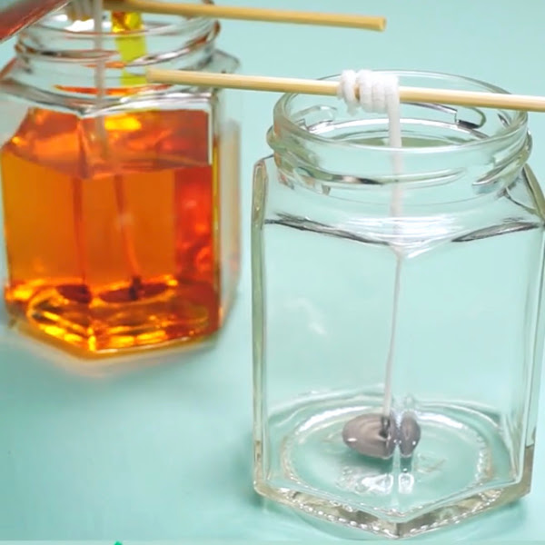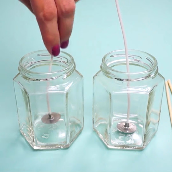 Nota: las cantidades indicadas producirán tres velas de tarro de seis onzas.Sobre los frascos de vidrio, aplica una gota de silicona caliente para colocar en el fondo las mechas de la vela.